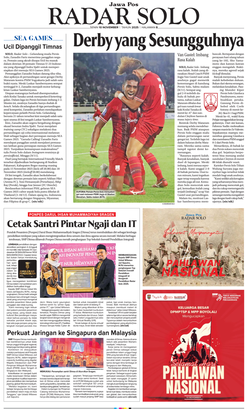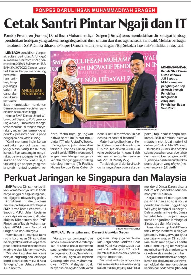 SRAGEN – Pondok Pesantren Darul Ihsan Muhammadiyah Sragen (DIMSA), yang telah berdiri sejak tahun 1989, kian membuktikan diri sebagai lembaga pendidikan terdepan yang sukses mengintegrasikan ilmu umum dan ilmu agama secara inovatif. Melalui berbagai terobosan signifikan, SMP Ponpes DIMSA baru-baru ini menorehkan prestasi gemilang dengan meraih Penghargaan dari Jawapos Radar Solo sebagai Top Sekolah Inovatif Pendidikan Integratif.