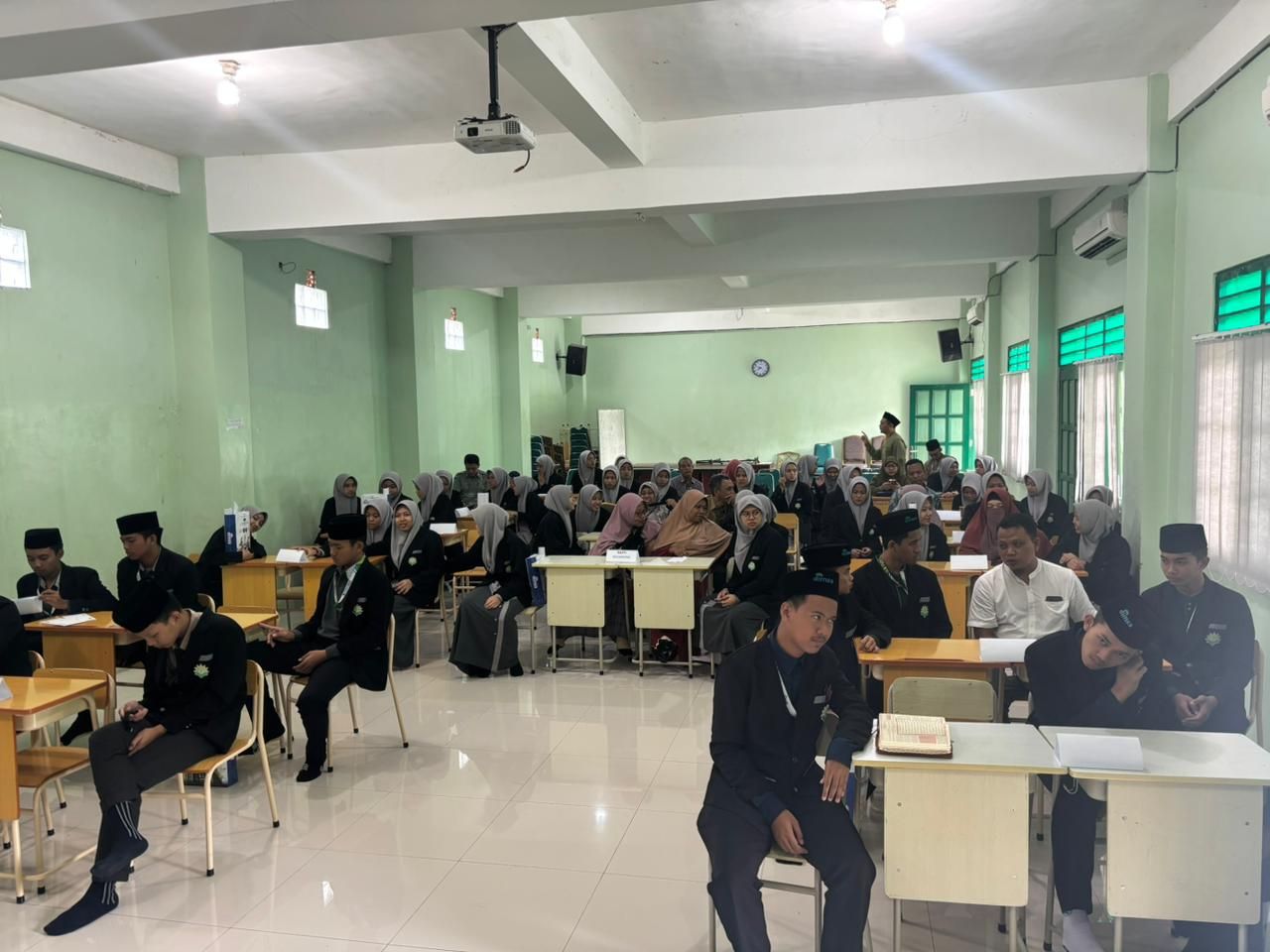Acara dimulai dengan pembukaan dan pembacaan ayat-ayat suci Al-Qur’an yang menghadirkan suasana religius dan penuh kekhusyukan. Para guru, tamu undangan, serta perwakilan penerima program turut hadir menyaksikan pelepasan para santri yang akan mengemban amanah dakwah di berbagai daerah.